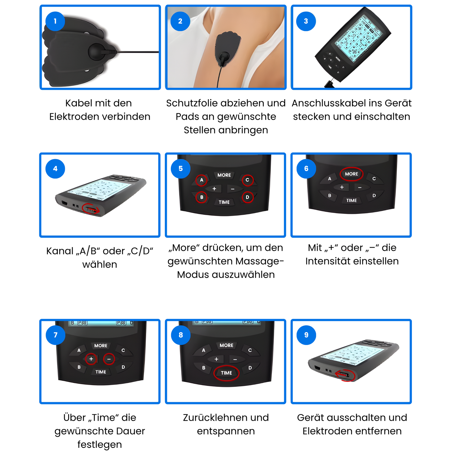 Grâce à une utilisation intuitive et des programmes clairs, vous pouvez commencer immédiatement. Il suffit de poser les électrodes, de choisir l’intensité et de se détendre – sans connaissances préalables ni réglages complexes.