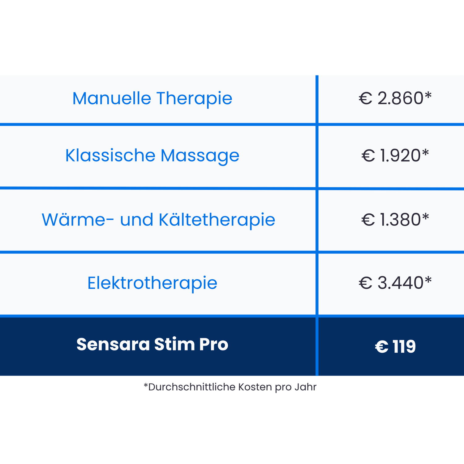 Avec le Sensara Stim Pro, vous économisez des visites coûteuses en cabinet pour des massages, de la thérapie manuelle ou des traitements par électrostimulation – et vous profitez des mêmes effets confortablement chez vous.